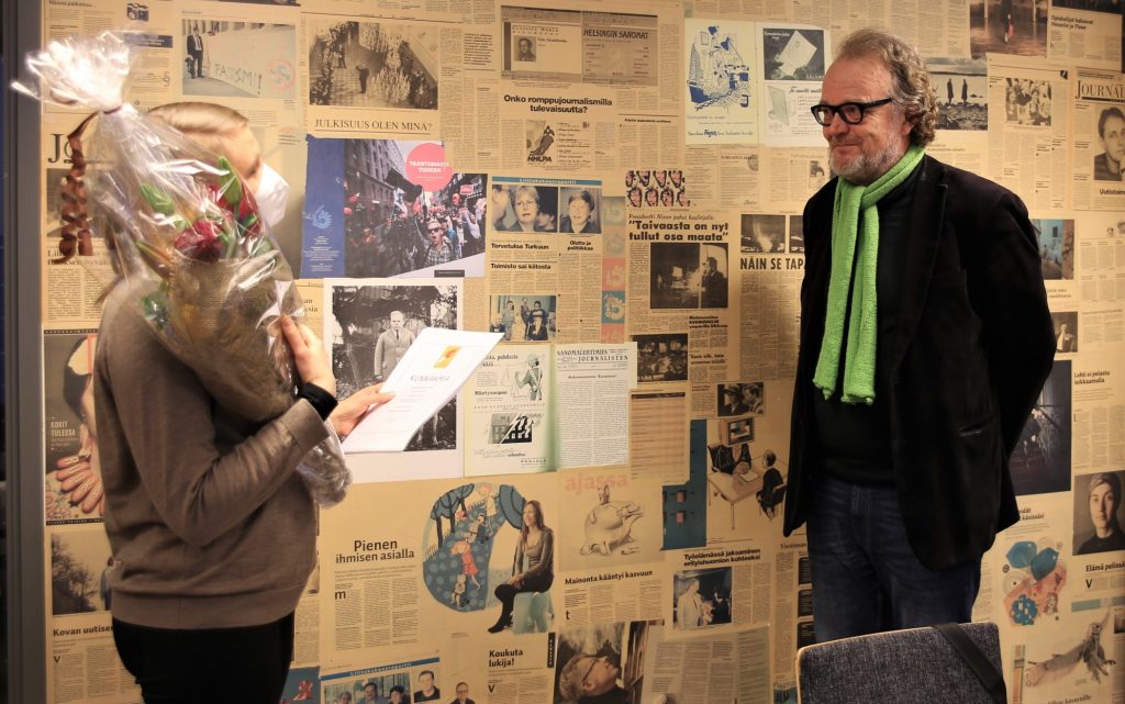Etäkokouksesta huolimatta Veli-Pekka pääsi noutamaan kunniakirjansa Journalistiliiton tiloihin kokoontuneilta kokoustoimitsijoilta.