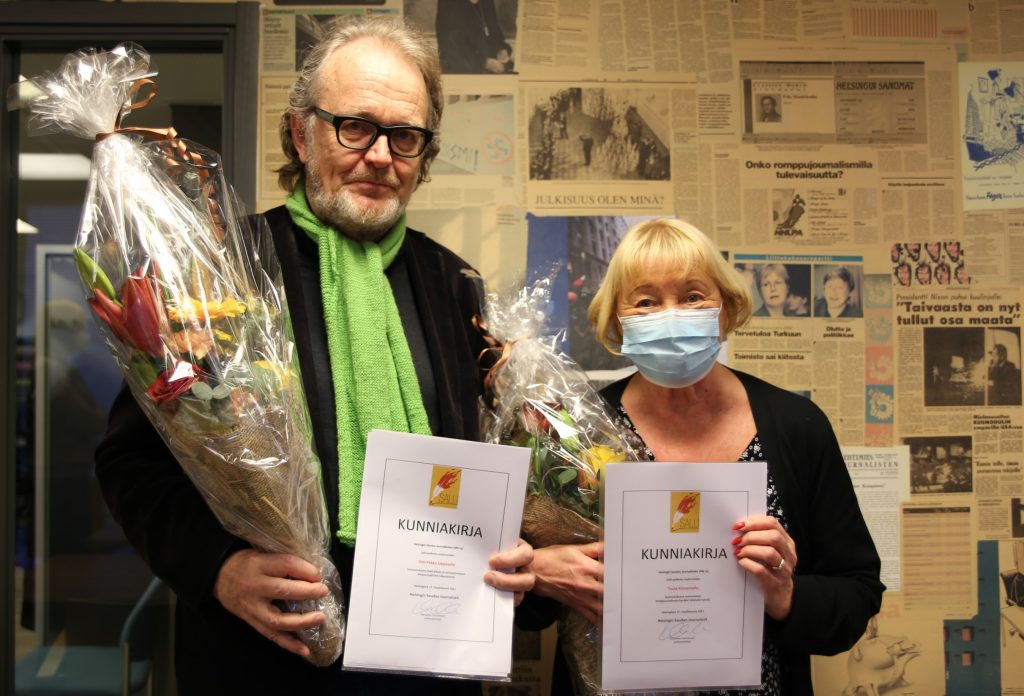 Palkituilla on pitkä tausta luottamustehtävissä: Veli-Pekka Leppäsellä niin HSJ:ssa kuin Journalistiliitossa ja Tuula Kinnarisella työyhteisössään, yhdistyksessä ja liitossa. Molemmat palkitut saivat kokousväeltä ansaitut etäaplodit.