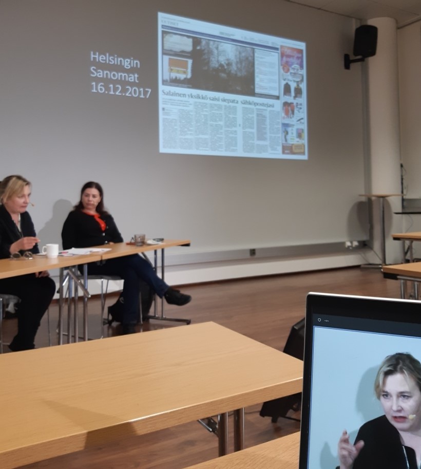 Kolme HS:n journalistia on tällä hetkellä syytettynä turvallisuussalaisuuden paljastamisesta ja paljastamisen yrityksestä oikeusjutussa, joka perustuu vuonna 2017 HS:n julkaisemaan artikkeliin. Sotilaistiedustelua käsitelleen artikkelin johtaminen syytteeseen ja toimittajia uhkaavaan vankeusrangaistukseen on Suomessa täysin poikkeuksellista. Toimittaja Iida Simeksen johdolla näkemyksiään hotelli Presidentissä avasivat viestintäoikeuden professori Päivi Korpisaari (HY) ja oikeustoimittaja Susanna Reinboth (HS) juristi Tytti Oraksen (SJL) osallistuessa keskusteluun etänä. Keskustelua käytiin hybridisti.