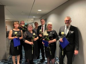 Valtuuston syyskokouksen yhteydessä jaettiin myös Journalistiliiton ansiomerkkejä erityisen ansioituneille jäsenille. HSJ onnittelee ansiomerkin saajia, joita ovat Kirsi Mattila (kuvassa vas.), Marko Korhonen (HSJ), Anne Kotipuro, Leena Kosonen, Pekka Pajala, Soila Saroniemi (HSJ) ja Tapio Räihä.