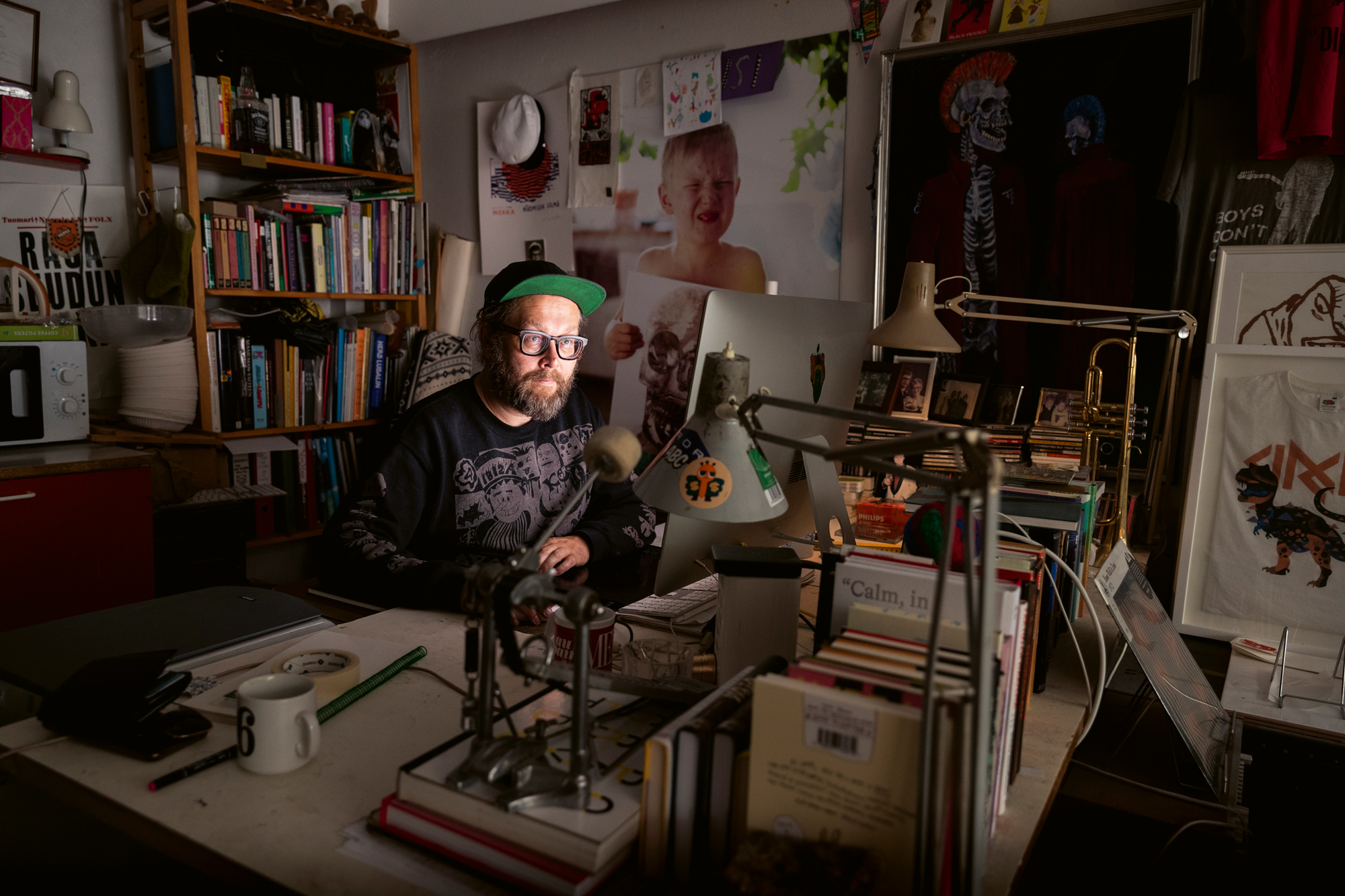 Jussi Karjalainen on palkittu graafikko ja kuvittaja, jonka kädenjälki näkyy muun muassa Miki Liukkosen ja Laura Lindstedtin teosten kansissa. Hänkään ei näe itseään taiteilijana, vaan käsityöläisenä, joka toteuttaa asiakkaan toiveita ammattiylpeydellä ja parhailla mahdollisilla työkaluilla.