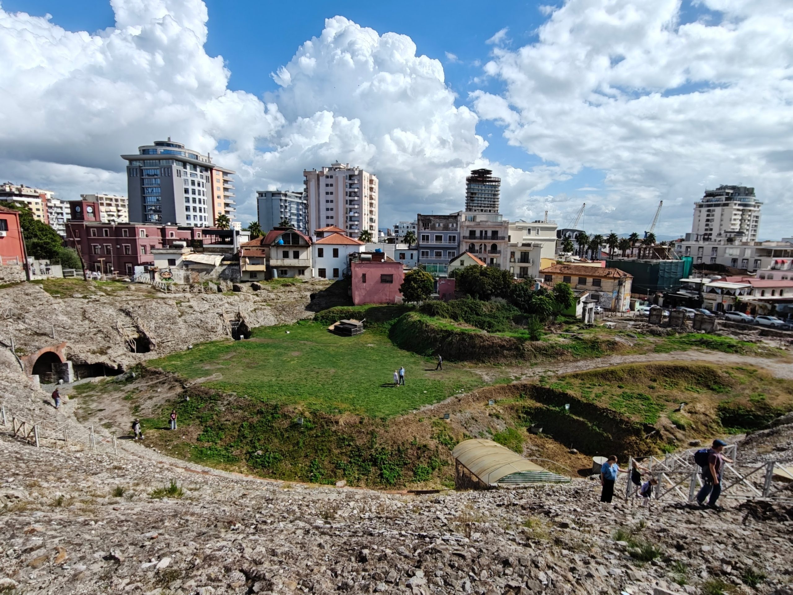 Durrësissa vierailemme vuonna 1966 löydetyssä roomalaisessa amfiteatterissa. Aivan kaikkea ei ole saatu kaivettua esiin: amfiteatterin pientareella lepää vaaleanpunaisen talon ahteri. Mennyt ja nykyisyys kohtaavat kaikkialla yhtä sattumanvaraisesti.